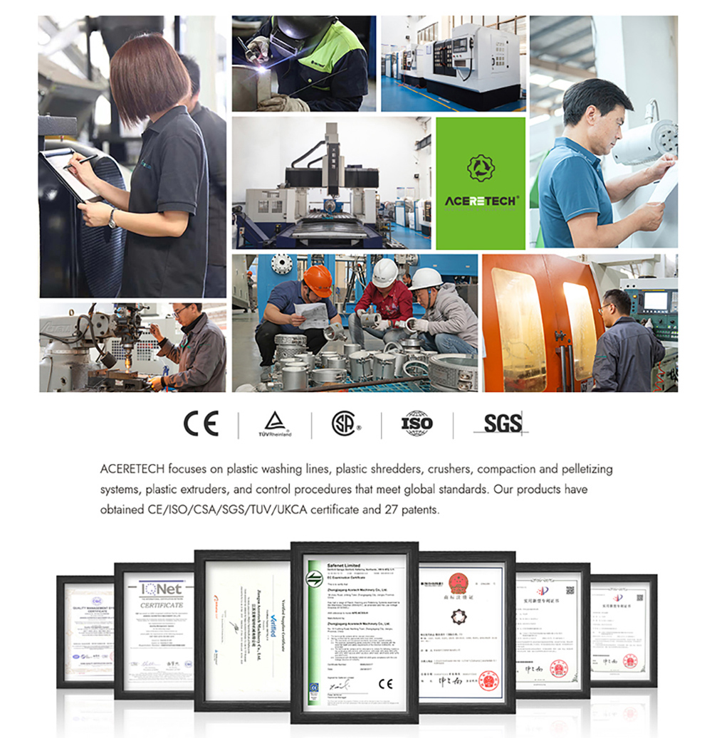 ACERETECH is an enterprise specializing in the R&D and manufacturing of waste plastic recycling equipment. It can provide continuous and stable solutions for waste plastic crushing, granulation and non-screen filtration, mainly for plastic recycling in factories and after consumption. ACERETECH technical team has engineers from Europe and China with more than 30 years of recycling experience, providing global customers with recycling solutions that meet the needs of the industry, and has successively established many overseas service providers and R&D branches. ACERETECH continues to provide Customers in Europe and the Middle East provide OEM services.Since the company's development, the main customer groups are in South America and Europe, and it has realized the after-sales service company that has the installation, commissioning and technical guidance required by customers in the local area. With the continuous accumulation of our plastic recycling experience and the closer cooperation with the European R&D department, we will combine the European technology at the forefront of recycling with the current recycling situation in China to customize a set of recycling solutions for customers.LLDPE/LDPE/HDPE /EPE film, crushed material, lithium battery film, foamed pearl cottonPP/OPP/BOPP/CPP film, woven bag, non-woven fabric (meltblown)BOPA/PA6/PA66 waste silk, factory waste, carpet material, waste clothPET/BOPET bottle flakes, film, silk, waste cloth, foam, optical filmPTT wireEPS/XPS pulverized material, cold briquette foam, hot melt foam, insulation boardHIPS/PC/ABS home appliance casing, electronic waste, engineering plasticsPVB pulverized material, automotive windshield laminated plasticPUAPEL optical materialPVDF functional film